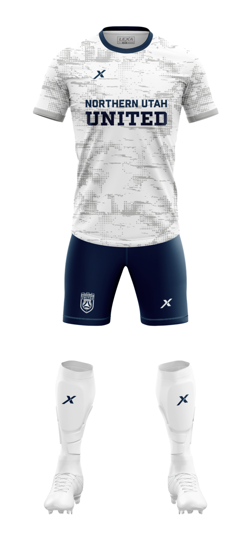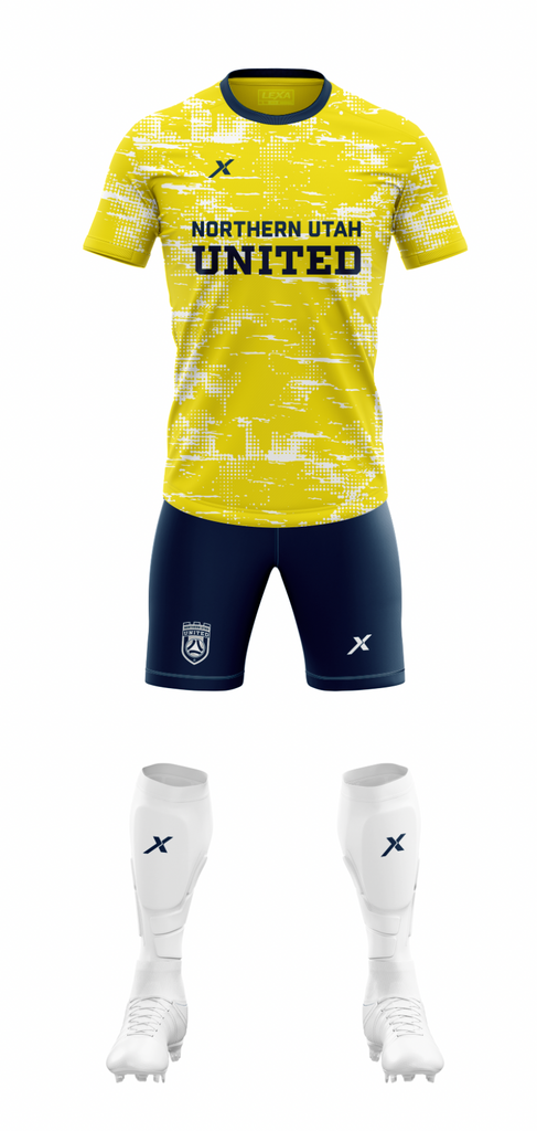 Player Package - Northern Utah United includes: 3 jerseys (white, navy, and yellow); 2 pairs of navy shorts; and 2 pairs of socks or sleeves (white and navy)