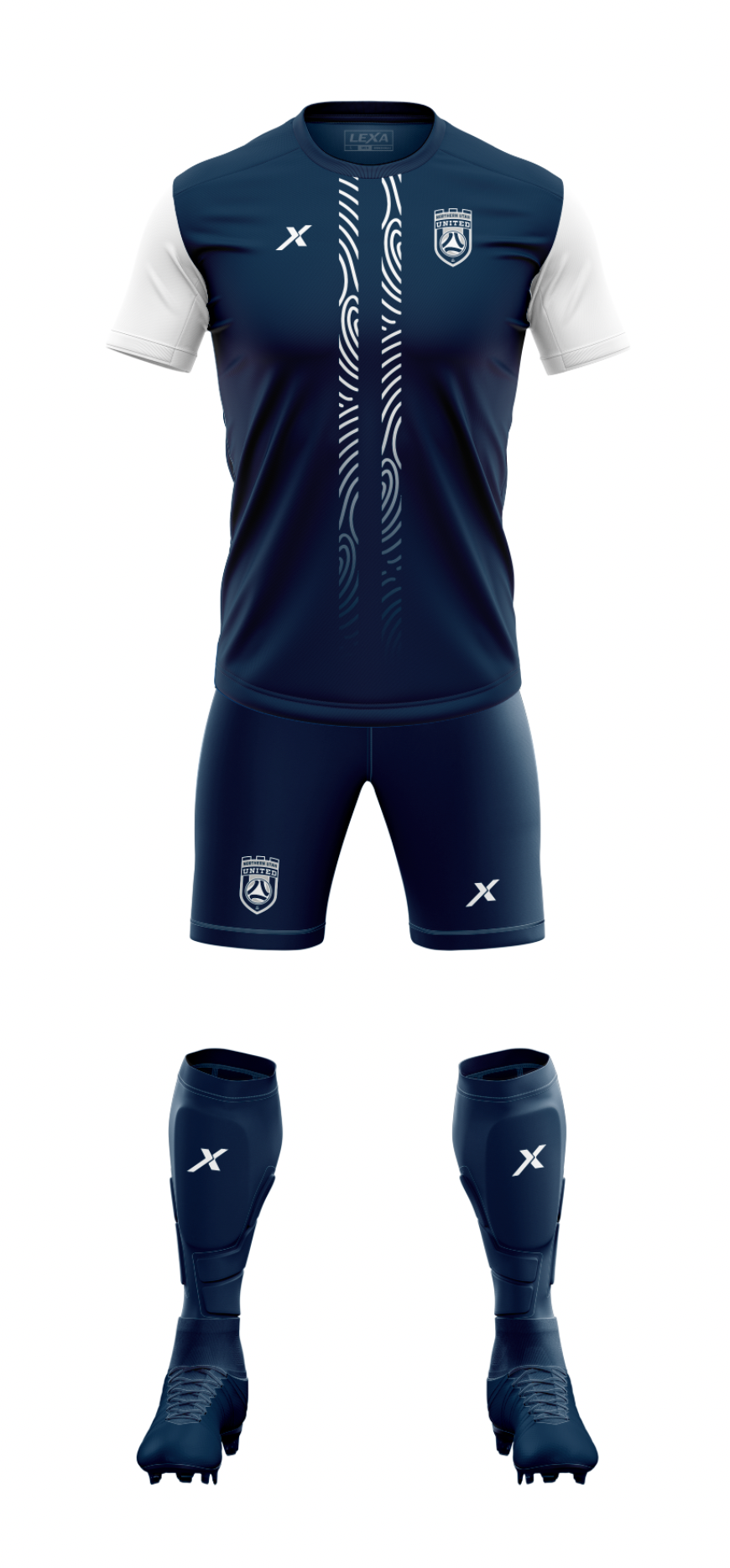 2. Player Package - Northern Utah United includes: 3 jerseys (white, navy, and yellow); 2 pairs of navy shorts; and 2 pairs of socks or sleeves (white and navy)